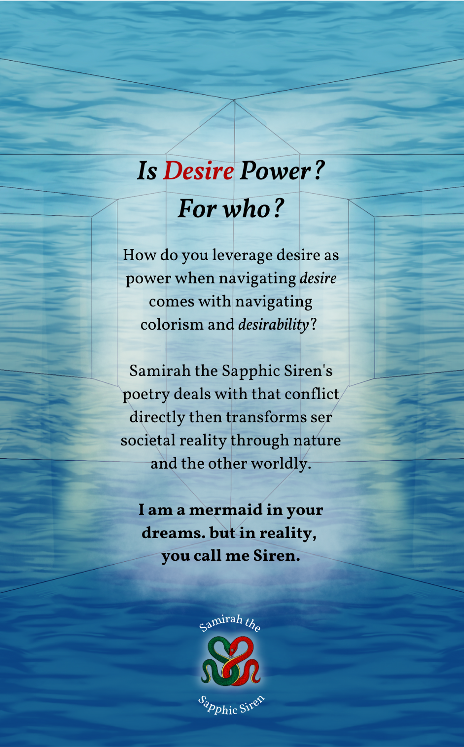 DESIRE vs. DESIRABILITY... How do you leverage desire as power when you keep hitting the same barrier - colorism AKA desirability. Samirah the Sapphic Siren’s poetry deals with this conflict directly, then transforms ser societal reality through nature and the other worldly.
